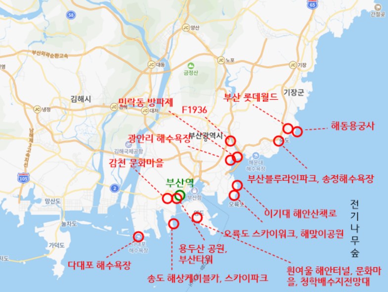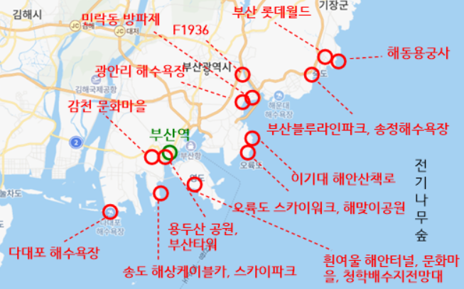 수도권에서 부산으로 여행을 가봅시다.