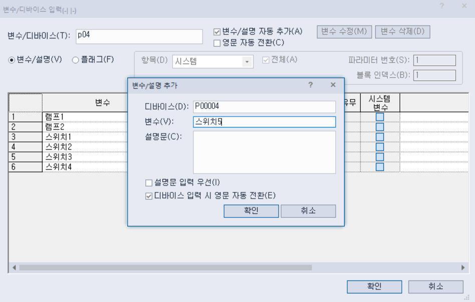 변수명을 넣을 수 있는 창이 뜹니다. 원하는 접점명을 넣으면 됩니다. 저는 스위치5라고 변수명을 적었습니다.