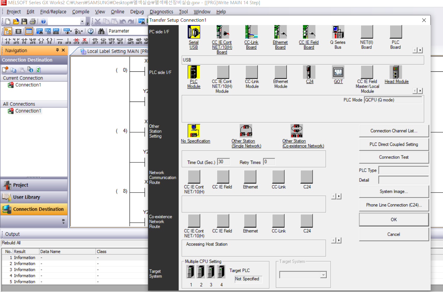 멜섹 gx works2 프로젝트 생성 후 왼쪽을 보면 Connection Destination이라는 부분이 있습니다.