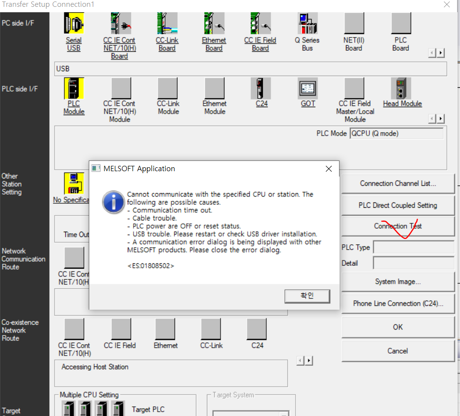 plc와 컴퓨터가 연결된 상태에서 다시 이 통신창에 들어가서 connection test를 누르면 successfully install 같이 성공적으로 driver가 설치되어 있다는 창이 뜨게 됩니다. 위의 화면은 실패창입니다.